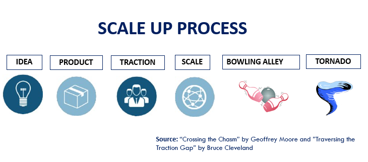 You have move from an idea to successfully ”traversing the traction gap” and “crossing the chasm” to scale up through the “bowling alley” and into the “tornado” of hyper-growth.